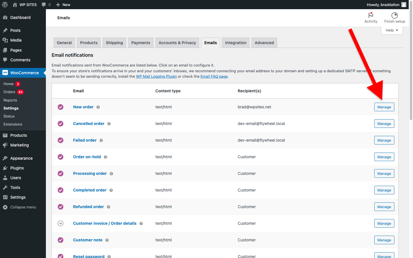 In your WordPress Dashboard, go to WooCommerce > Settings > Emails and click on the Manage button next to the email type you want to modify.