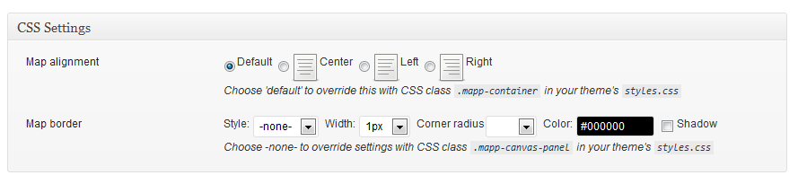 Here you can style your maps using CSS or use the settings for alignment and border customization.