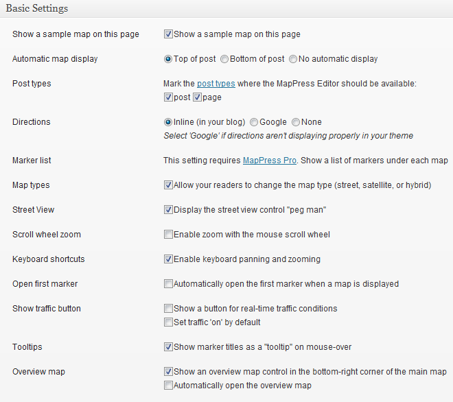 Post types – You can choose display the MapPress editor on posts and/or pages