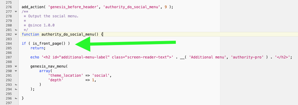 In this case, we’ve added the following conditional check to remove the social menu from the front page :