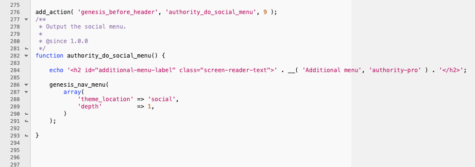 In the Authority Pro themes functions file, you’ll find the PHP code for the social menu between lines 276 – 293 which adds the third menu on all pages of the Authority Pro theme.