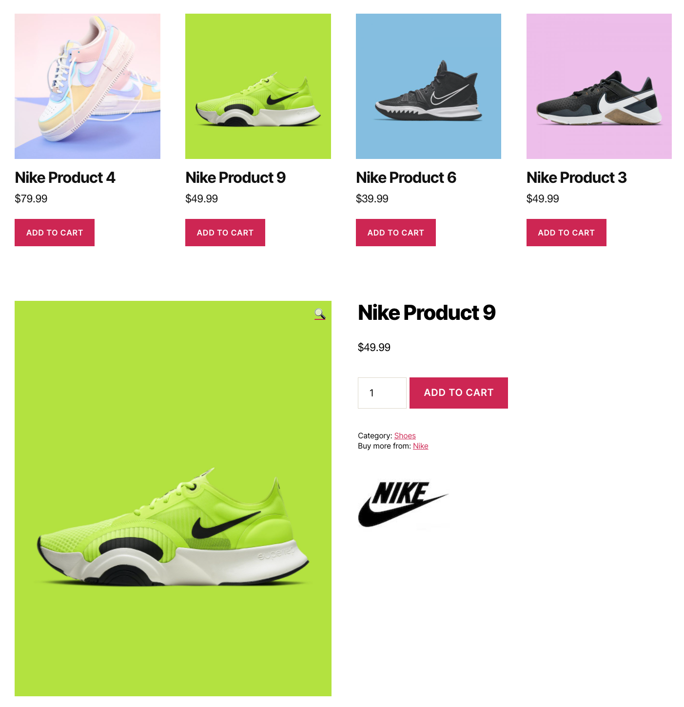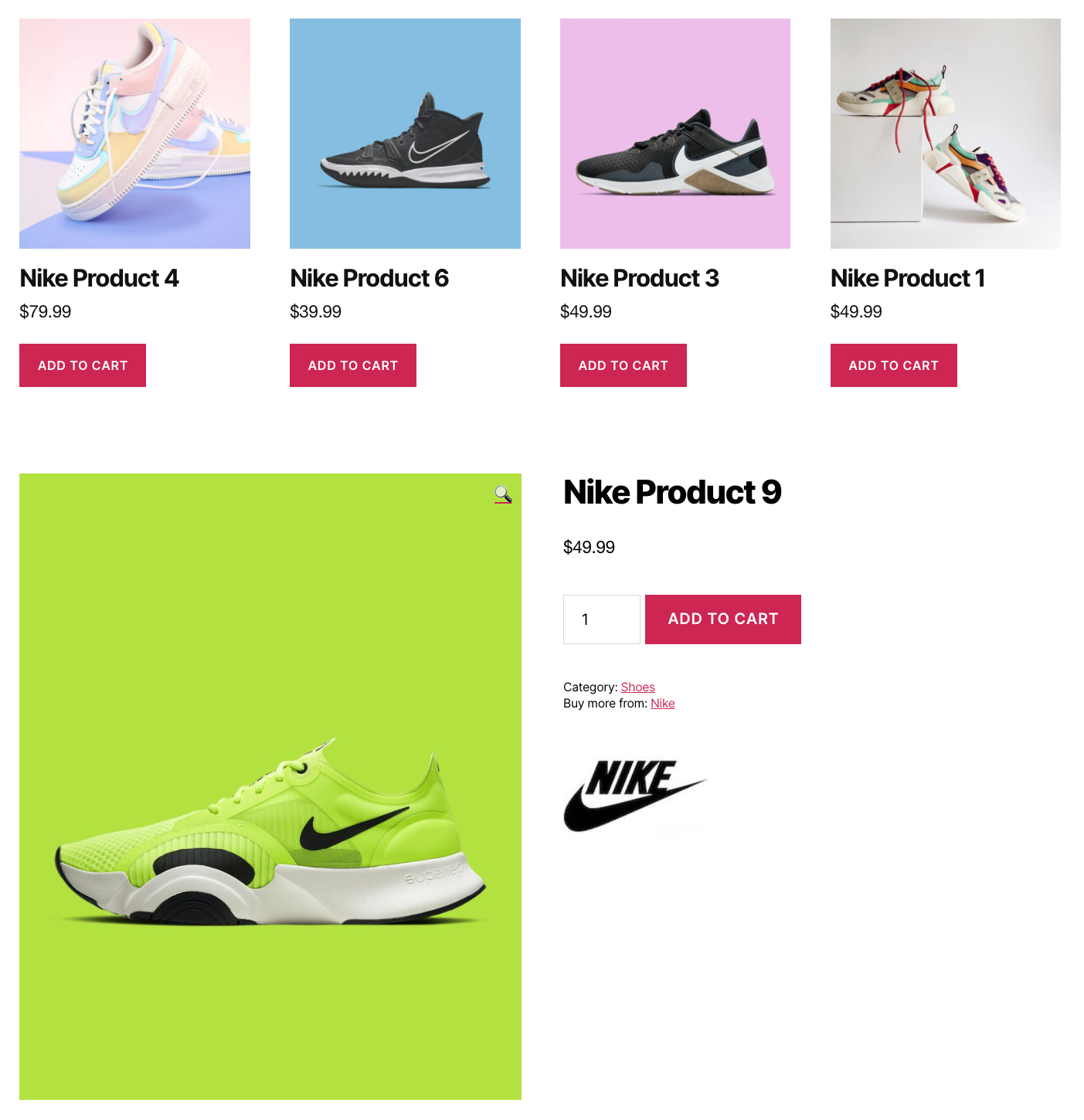 The gallery shows the green colored single product 9 included in the product shortcodes list on the left and removed on the right to avoid duplicate products displaying on the same single product page in WooCommerce.