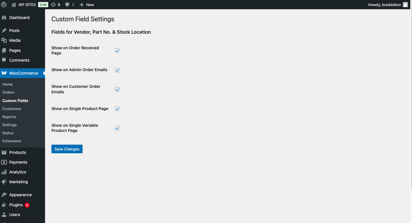 - A page for settings located in your WordPress Dashboard > WooCommerce > Custom Fields