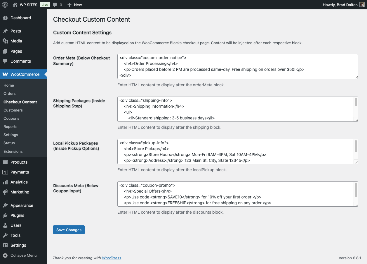 - Enter custom HTML content in the textarea fields for each checkout block location