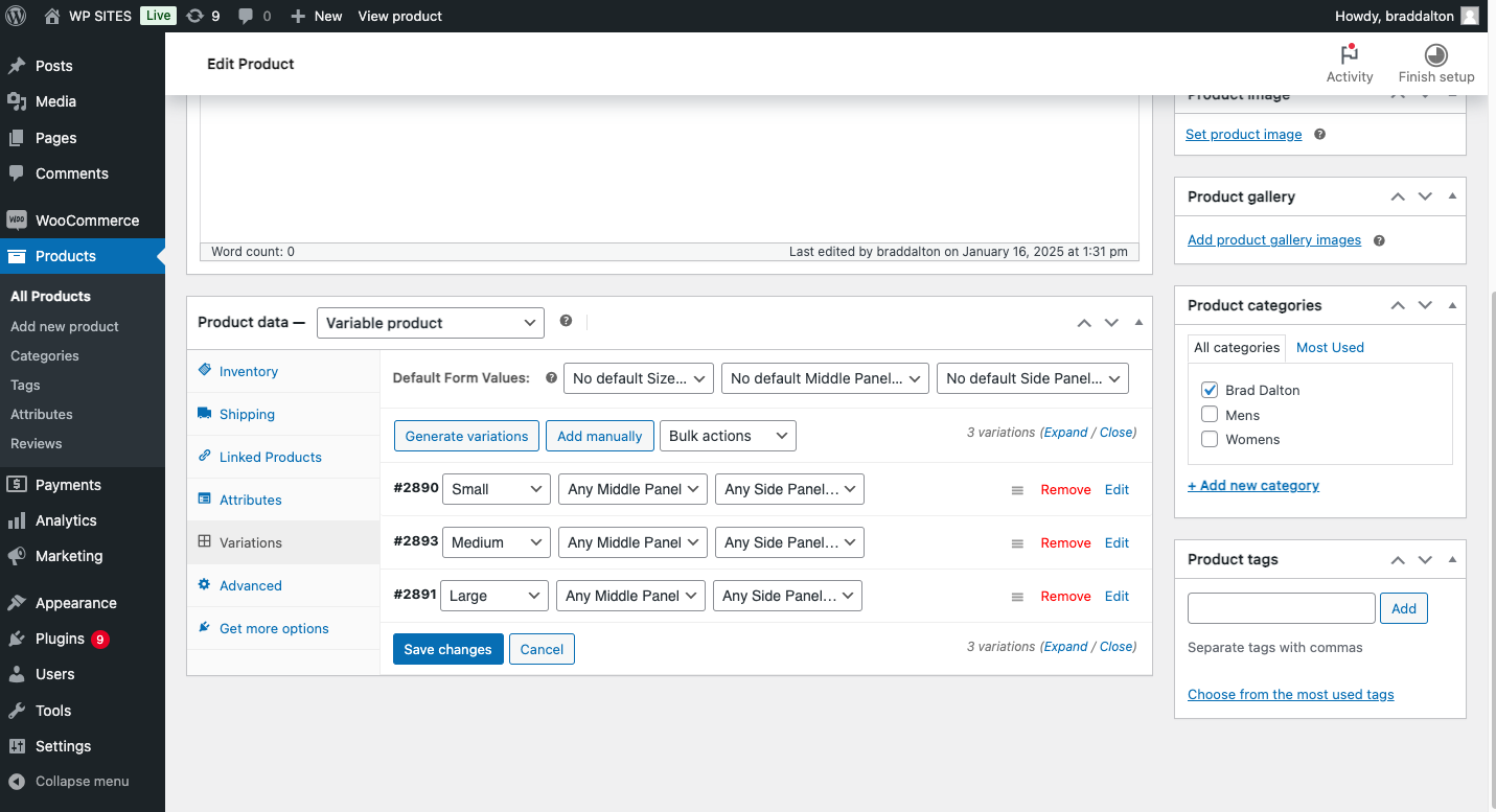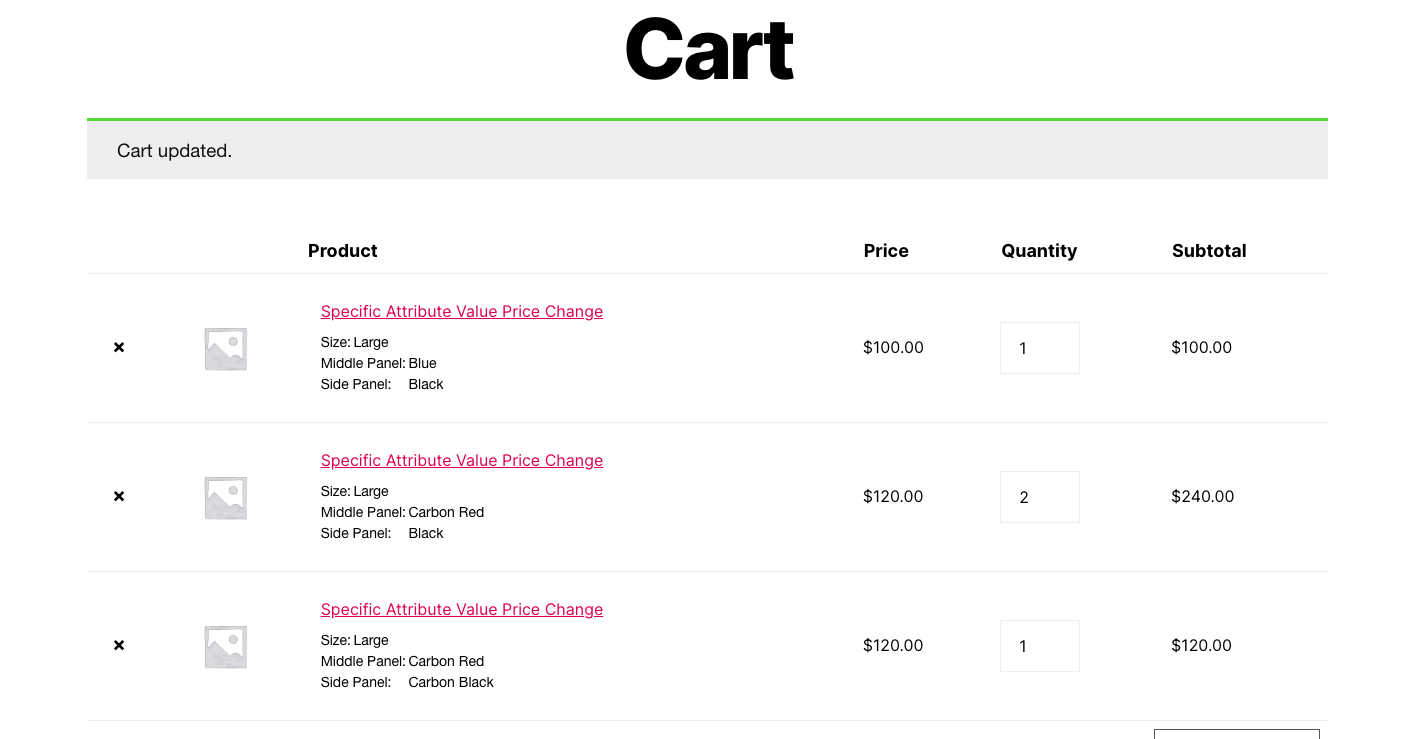 Click to enlarge screenshots of the variable product attributes, variations, single product page dynamic price change, cart and checkout pages.