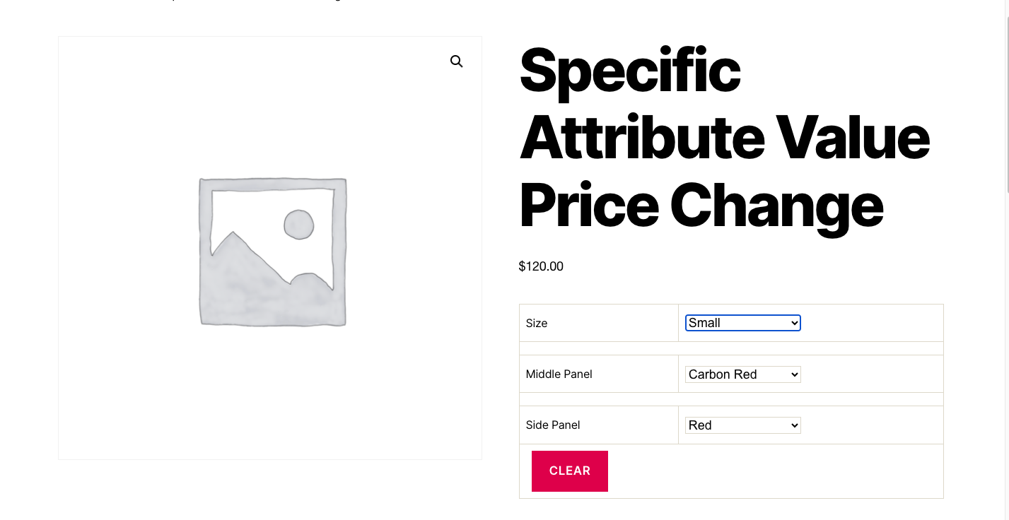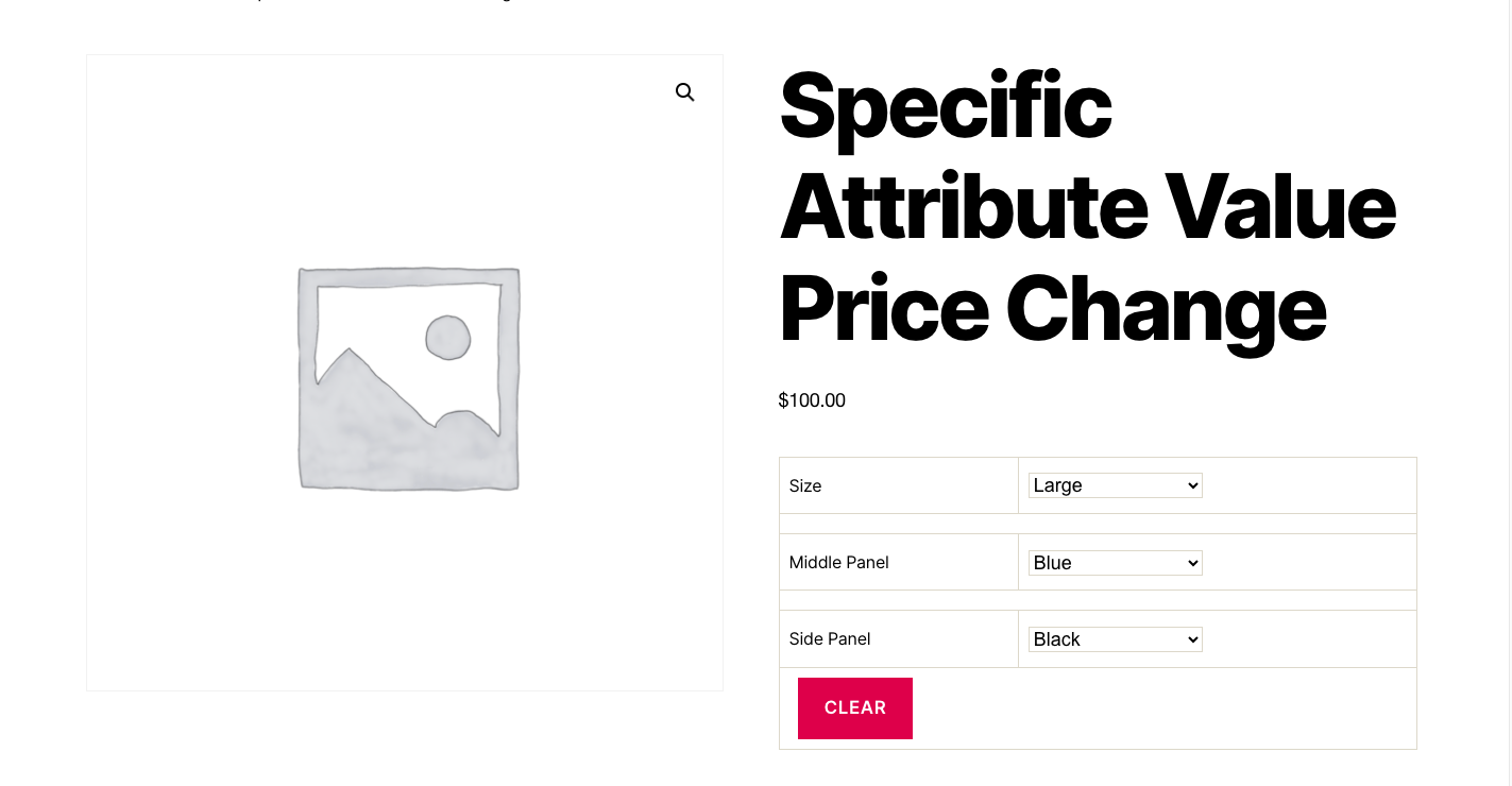 - Dynamically changes the price for specific attribute terms selected from the drop down menu on the single product page.