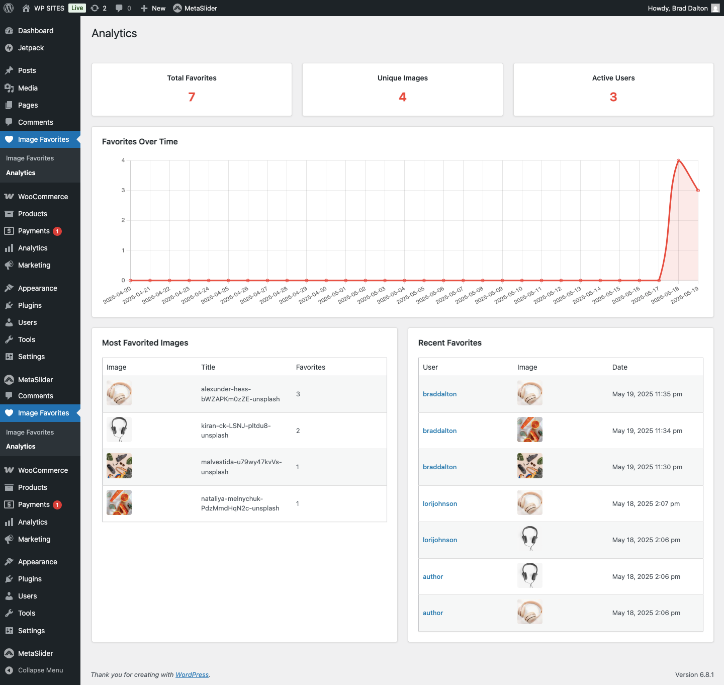 - Add the  [favorite_images] shortcode to any page or post which lists favorited slide images for each logged in user.