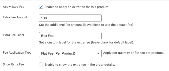 - A checkbox to show or hide the extra fee displayed in the order details, on the order received page and order emails sent to the customer