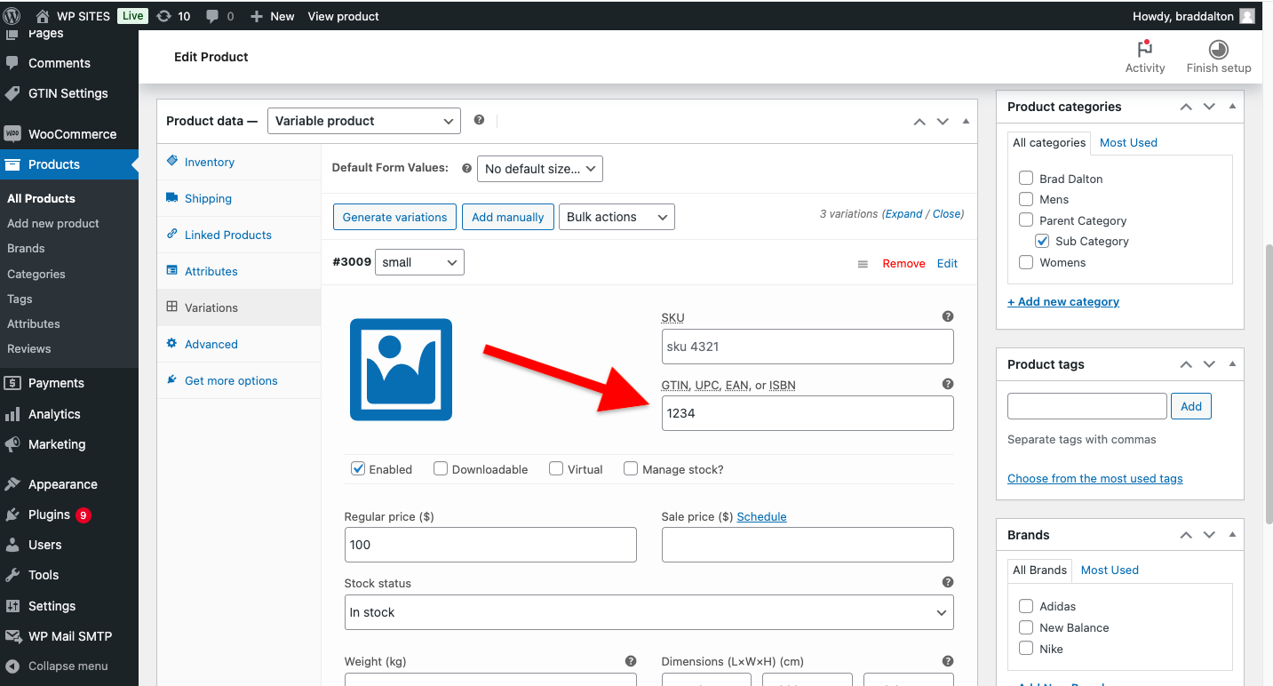 You’ll find the GTIN, UPC, EAN, or ISBN field on the Edit Product > Product Data – Variable Product > Variations tab.