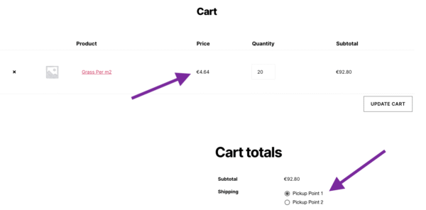 In this example, we uses 2 prices. The 1st price is set at 4.64 Euros for local pickup which we’ve renamed pickup point 1 and 2. The 2nd price is set at 4.40 Euros for orders which choose the delivery method.