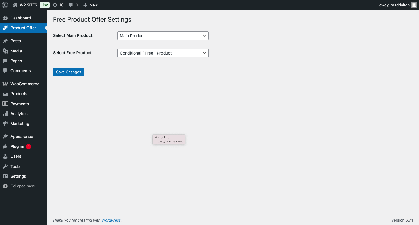 Once you have installed and activated the Conditional Free Product for WooCommerce by WP SITES, you’ll find a settings page added to your WordPress Dashboard named Product Offer. There’s only s steps :