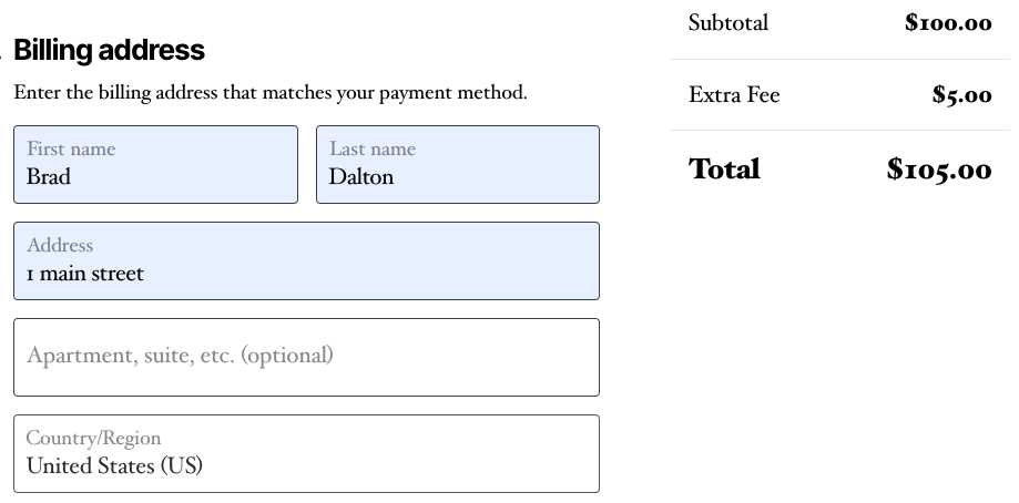 Here’s a couple of screenshots you can enlarge to see the above settings in action at checkout when using WooCommerce :