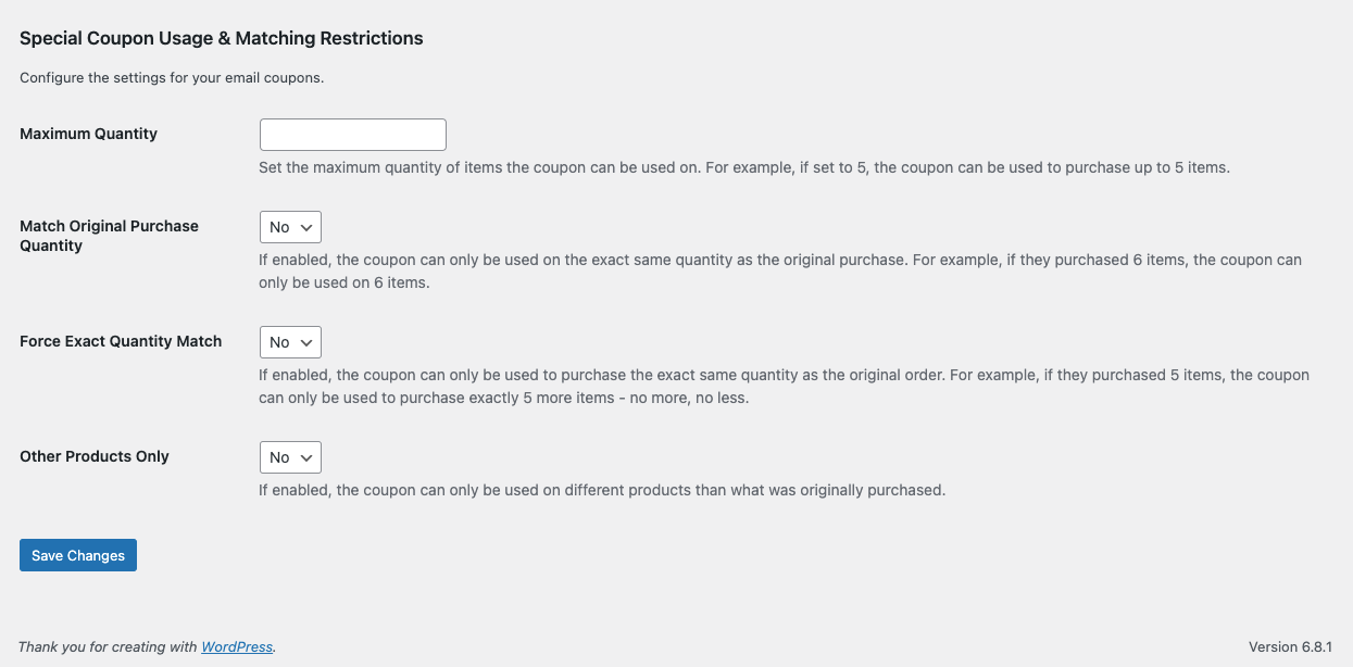 Here are the specific settings for coupon order quantity matching you can enlarge and checkout :