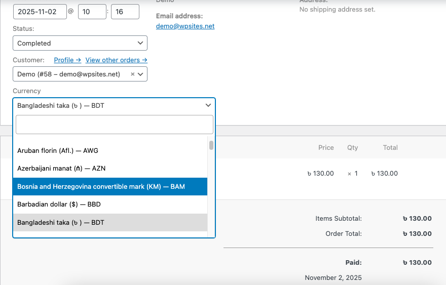 The selected currency will be saved and displayed in the order details.