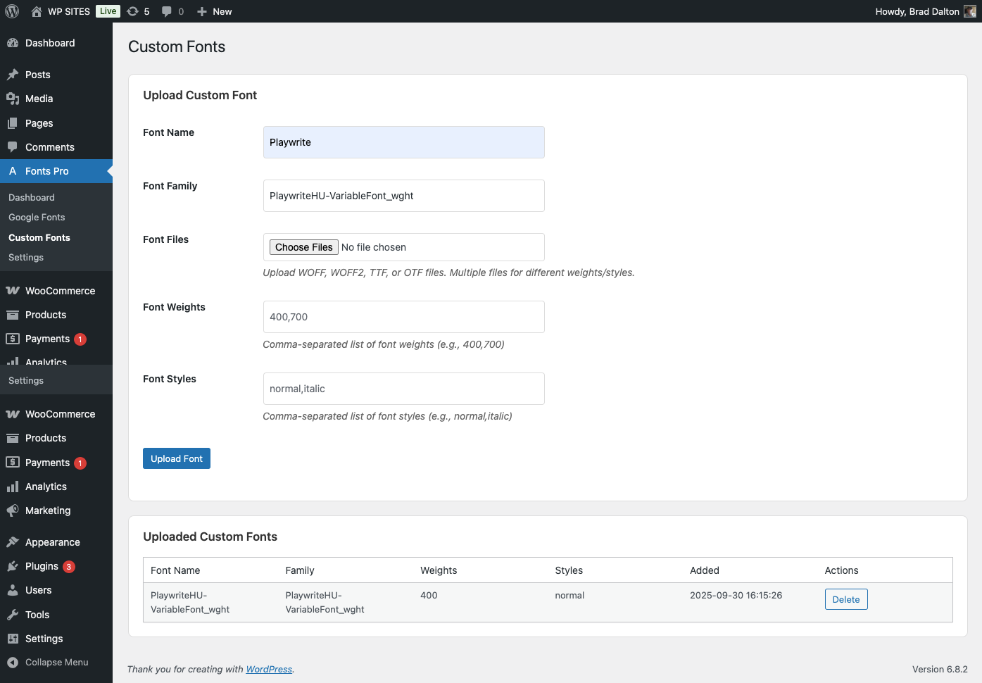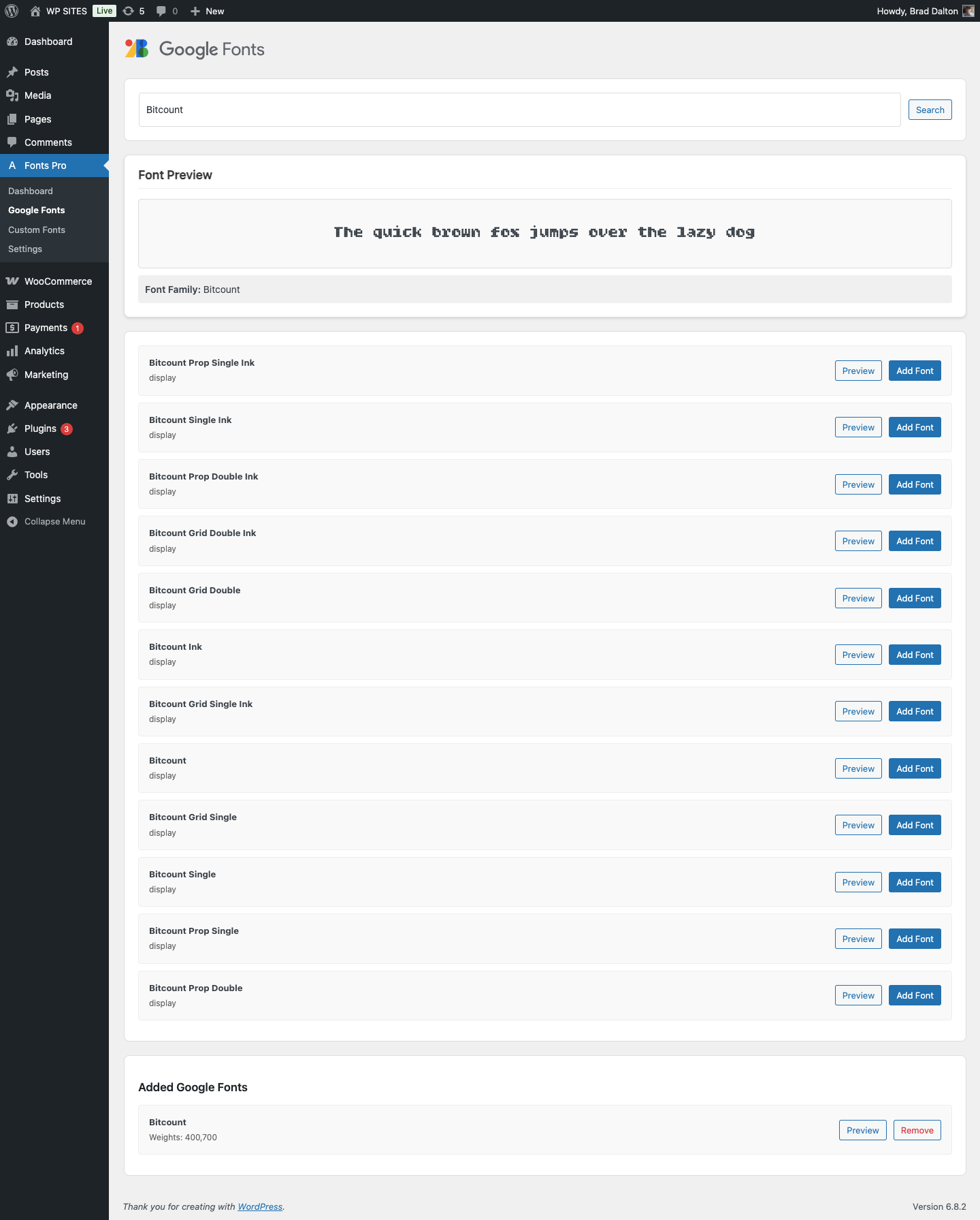 - In your WordPress Dashboard, go to Fonts Pro > Google Fonts