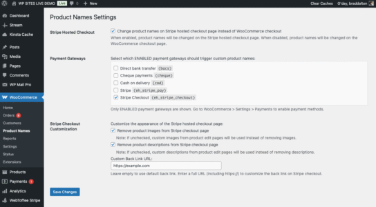 - Stripe Hosted Checkout: Choose whether to change product names on Stripe hosted checkout page or WooCommerce checkout page