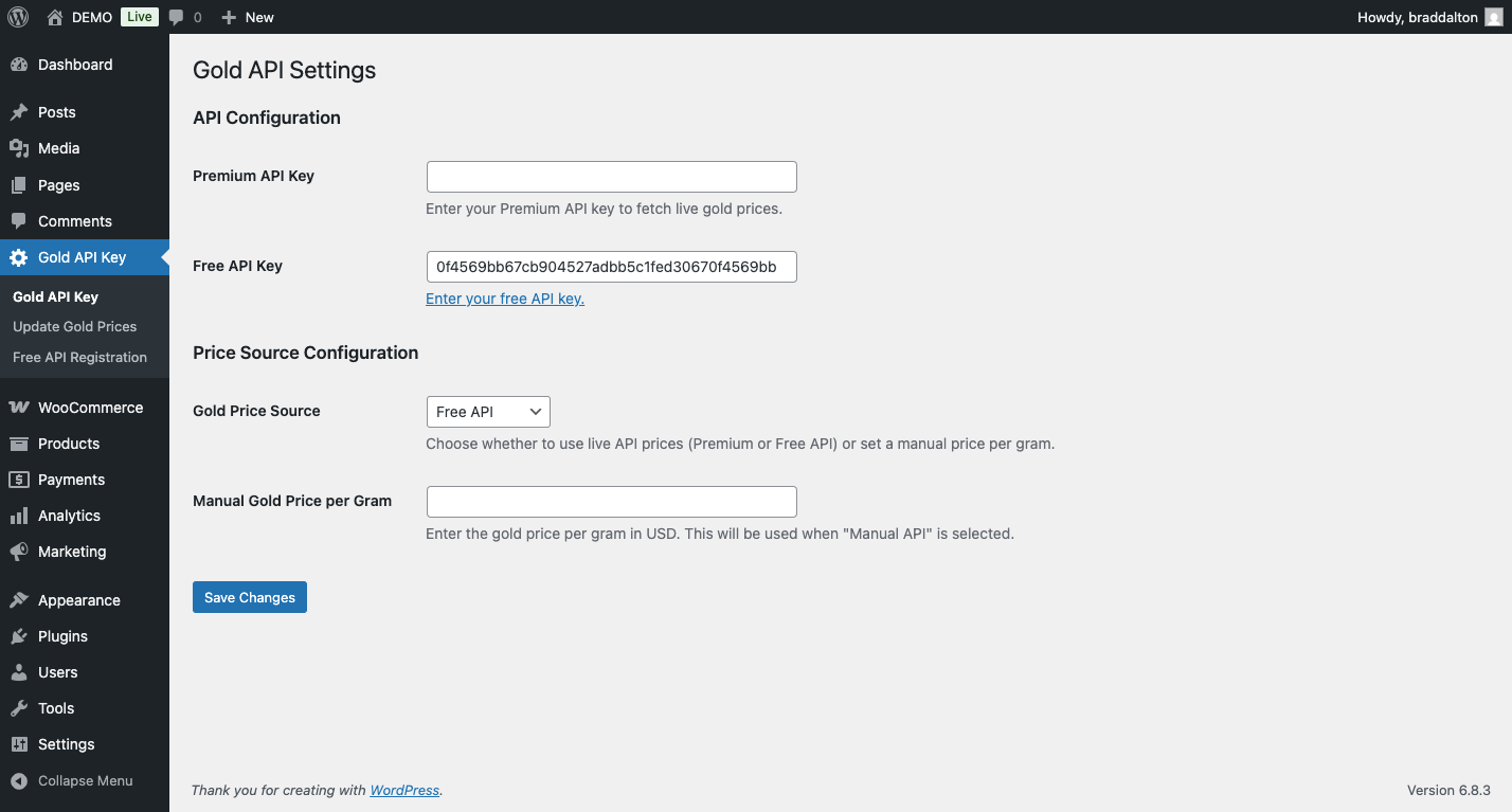2. Go to WordPress Admin → Gold API Key to configure settings