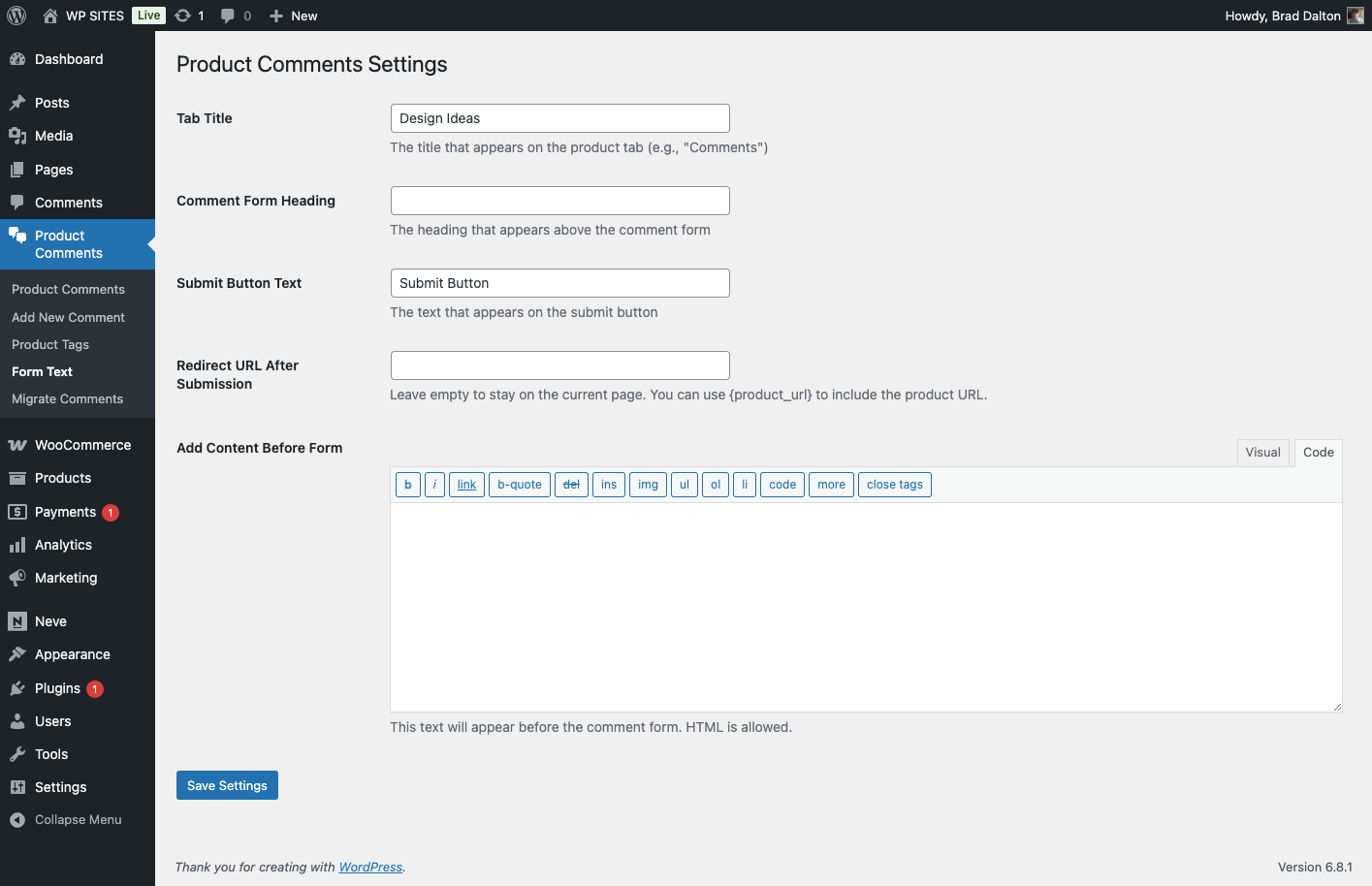 Form Settings (Product Comments > Form Text):