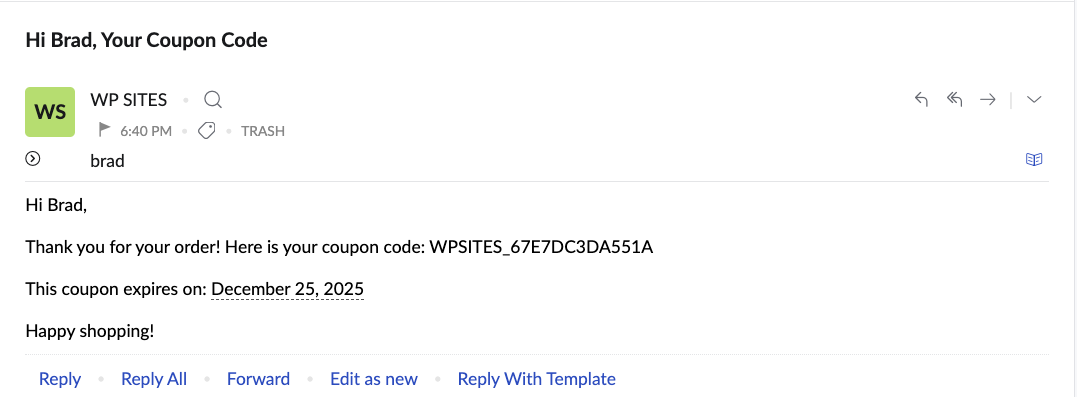 - A personalized email containing the coupon code and discount details is automatically sent to the customer’s email.