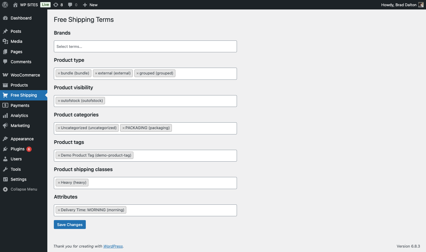 - Per-Term controls: select terms (categories/tags/attributes/custom product taxonomies) that force Free shipping