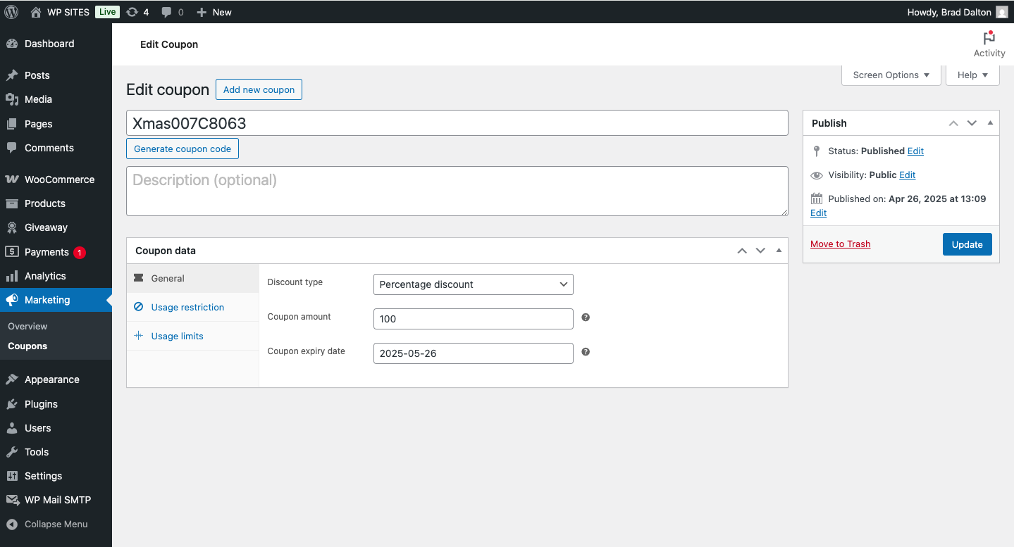 Once you have generated the coupons, you can go to Marketing coupons and configure any settings for usage limits and restrictions per coupon.