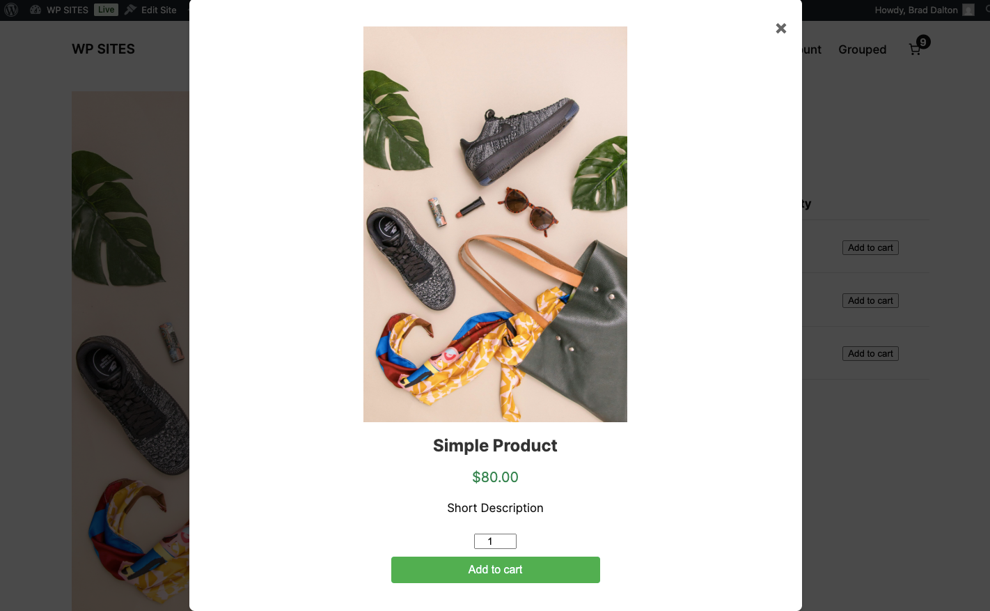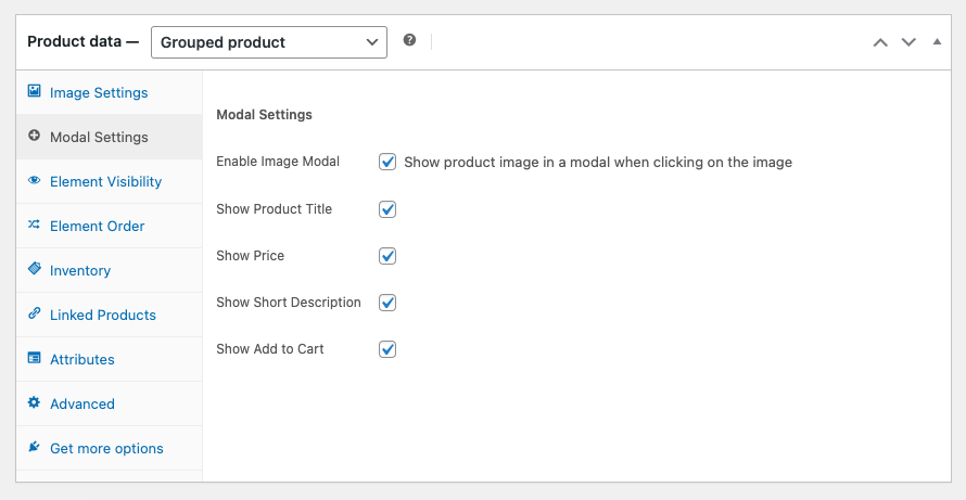 Once enabled, you can add a modal which displays your product image and other elements when the grouped product thumbnail is clicked.
