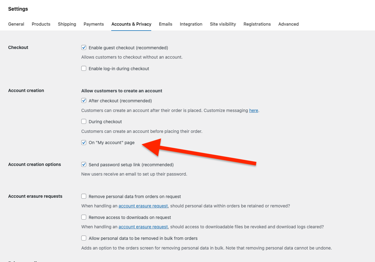 Remember to make sure WooCommerce > settings > Accounts and Privacy > Account Creation > On My account page is enabled.