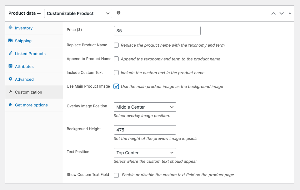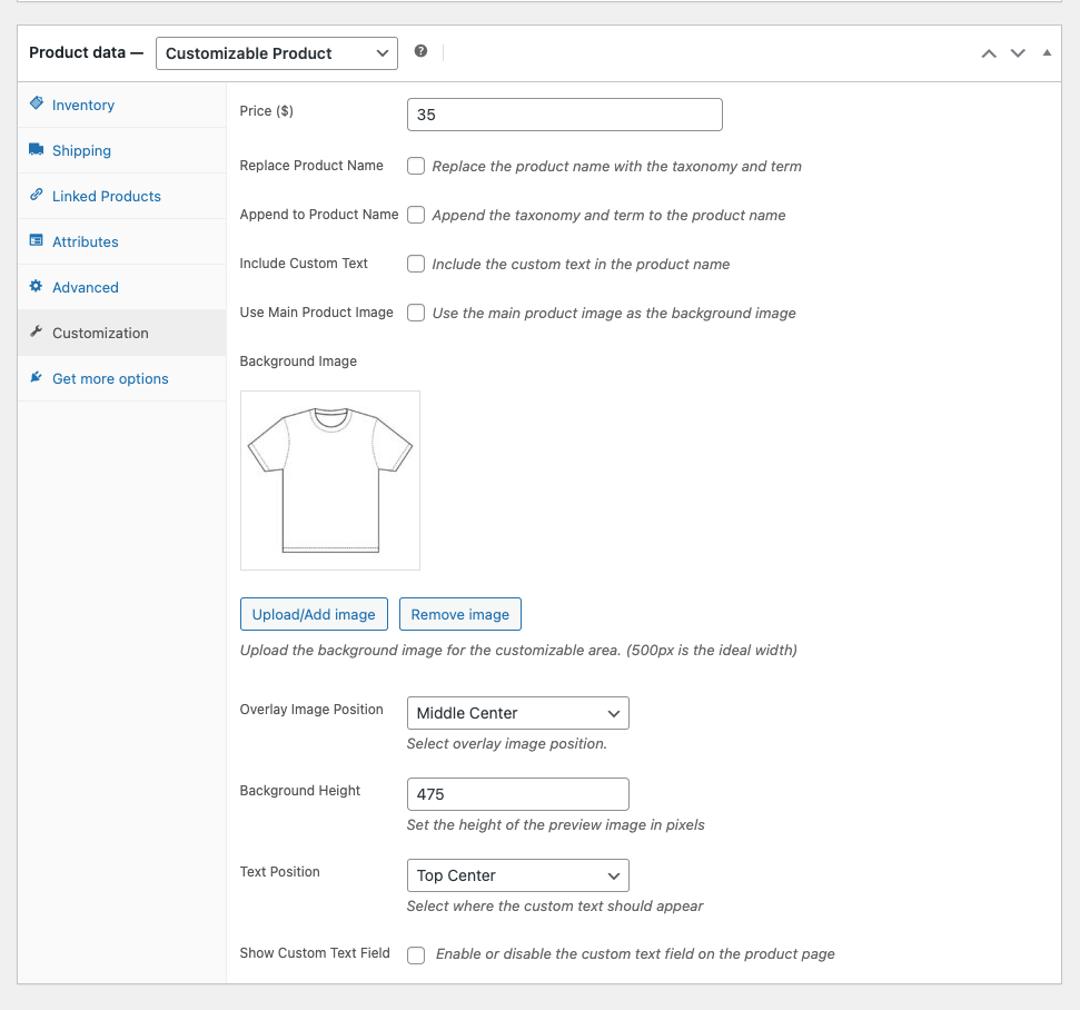 Once you install and activate the plugin, create a new Customizable Product and click the Customization tab to access the settings. You’ll then need to :