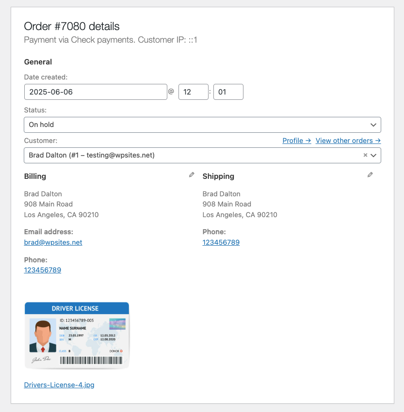 Uploaded files are stored in the WordPress media library and are attached to the order.