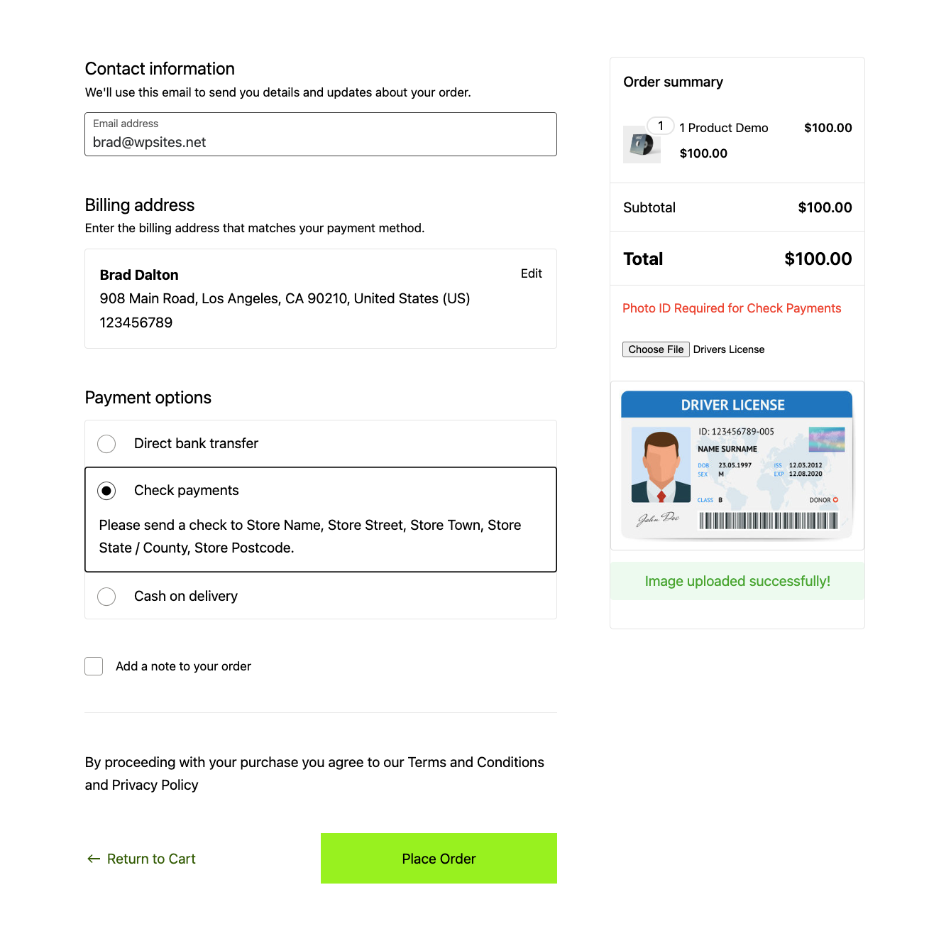 Shows the checkout page file upload image added to the order details are checkout complete and the plugin settings enabling display of the uploaded image in 5 different locations.
