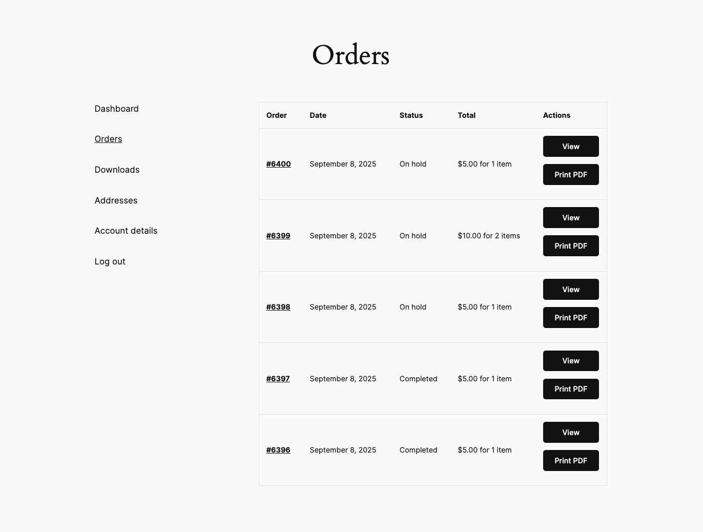 - Show PDF Link in My Account: Add “Print PDF” link to My Account orders page