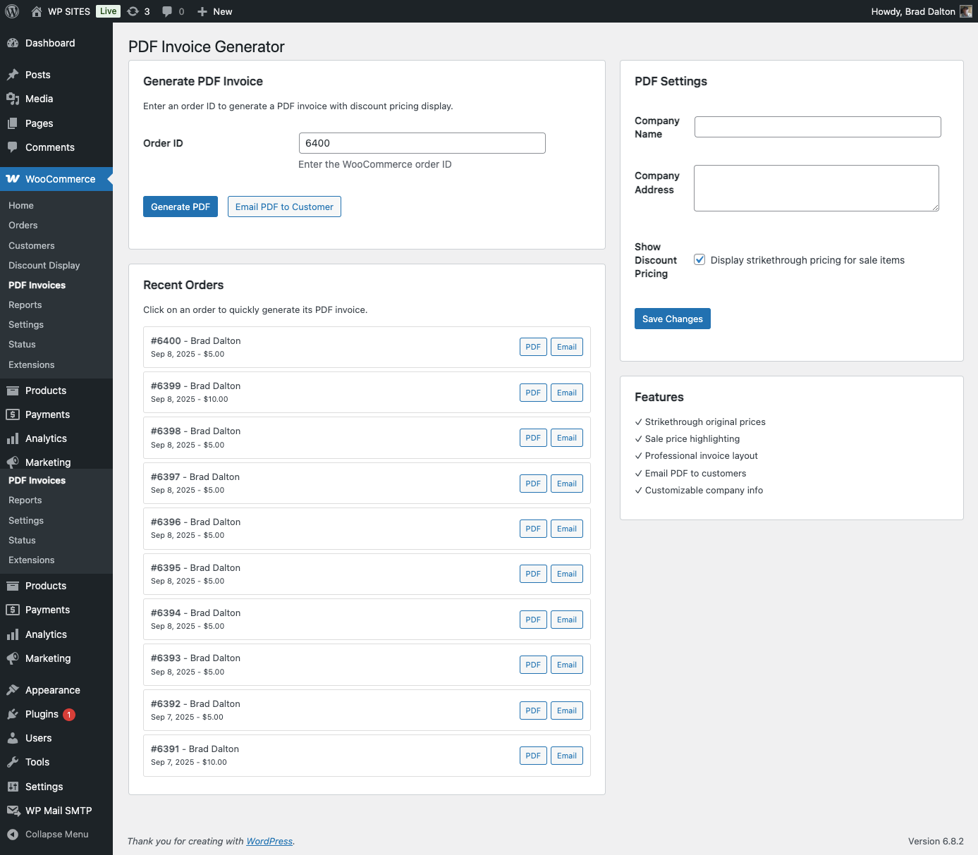 Access the dedicated PDF generator at WooCommerce > PDF Invoices: