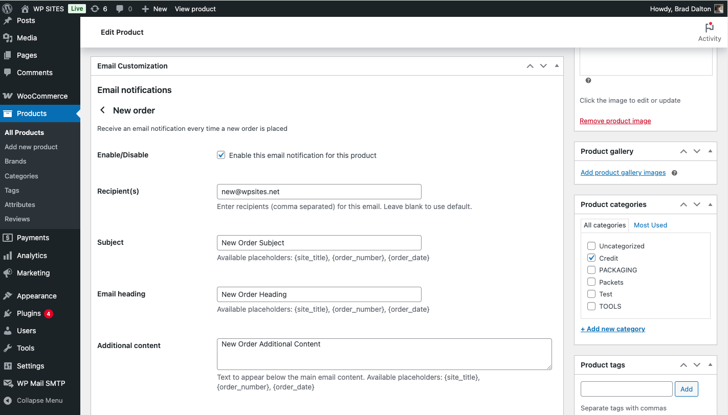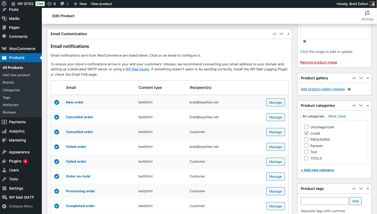 A WordPress plugin for WooCommerce that enables you to customize built in emails on a per product basis using the same settings interface WooCommerce uses for email notifications. On your Edit Product page, you can customize the settings for each listed email.