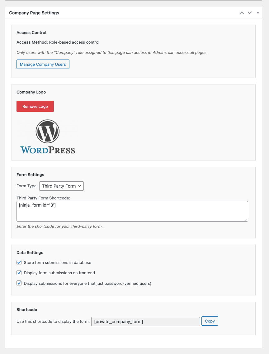 shortcode in your page content to display the form. The shortcode will automatically use the form configuration from the current company page.