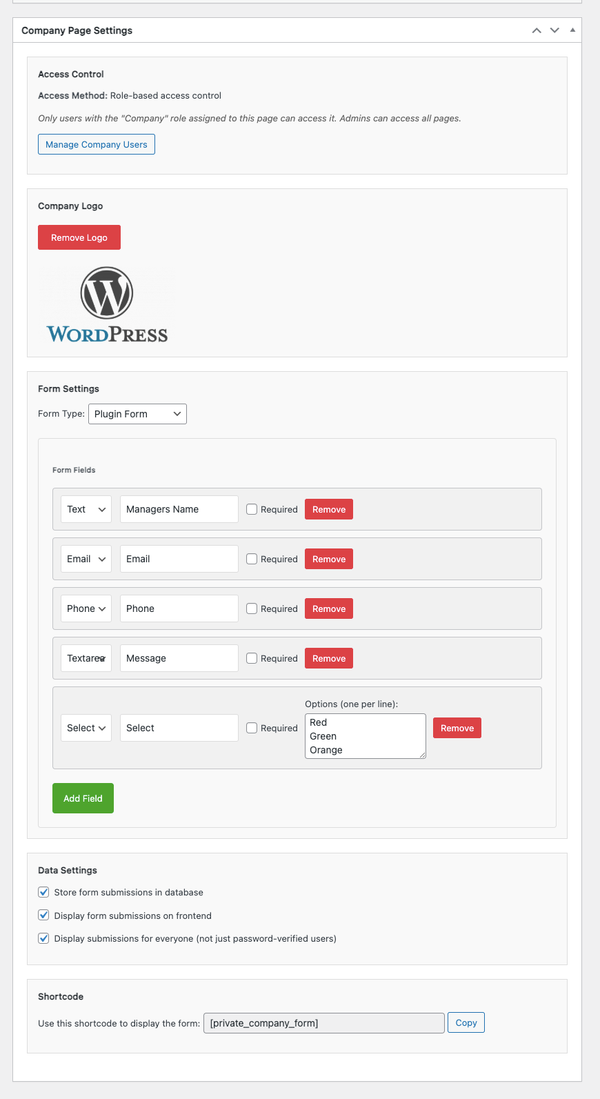 A WordPress plugin that creates access control for password protected company pages with customizable forms for secure data collection.