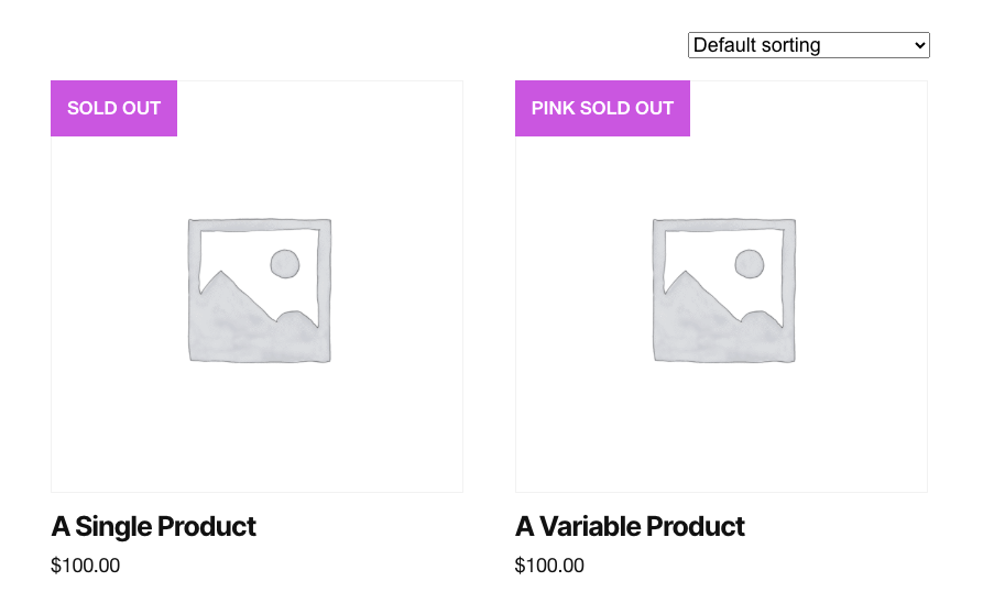 Product Badges for WooCommerce enables you to display a badge, like the default sale badge, for WooCommerce products that are out of stock. Works with simple and variable products, including individual variation attributes, on single product pages and shop page archives.