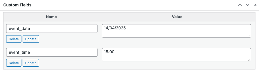 - Custom field settings to add the custom field key that contain the event date and time information. You can use this to add the date and time using your own custom field keys or enter the keys generated by a plugin like an events or custom fields plugin like ACF.