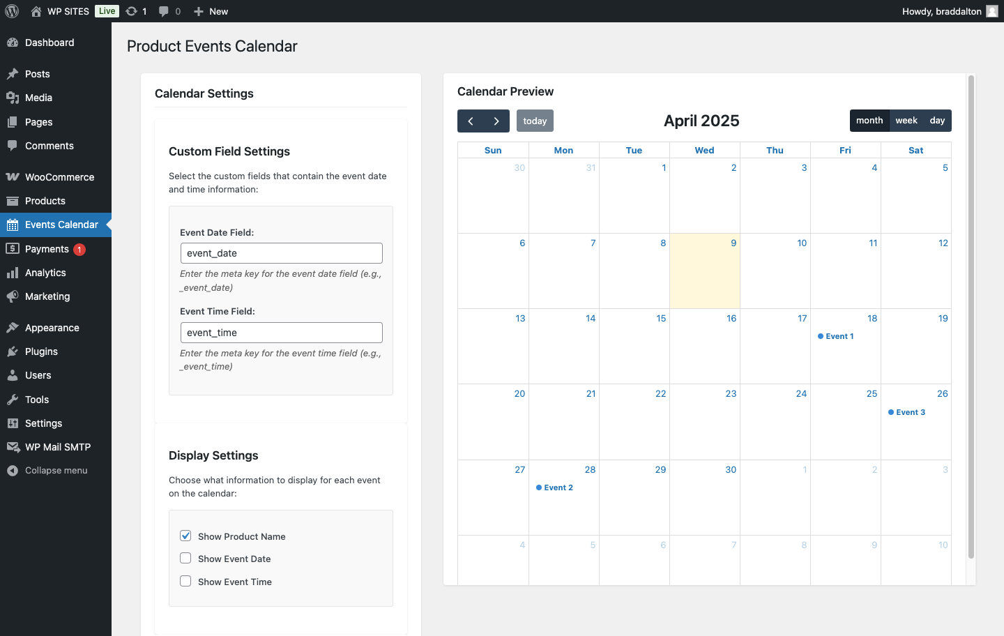 - After plugin activation, go to the Events Calendar menu in your WordPress Dashboard > Custom Field Settings and add your custom field keys. If using a custom fields plugin or events plugin, add the keys for your date and time.