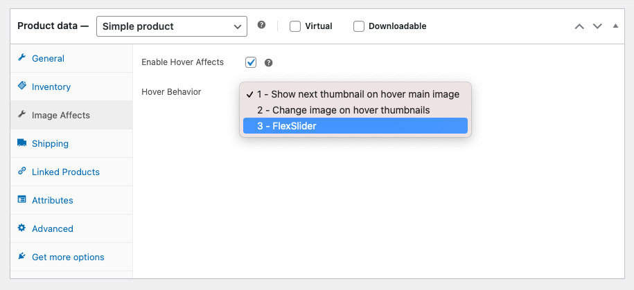 Once you activate the plugin, you’ll find a custom tab added in your single product data named Image Affects. Choose an affect and it will apply on a per product basis.