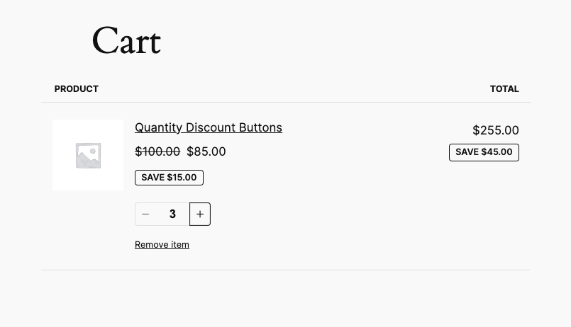 Discounts are also shown on the cart page for the product price and cart total like this :