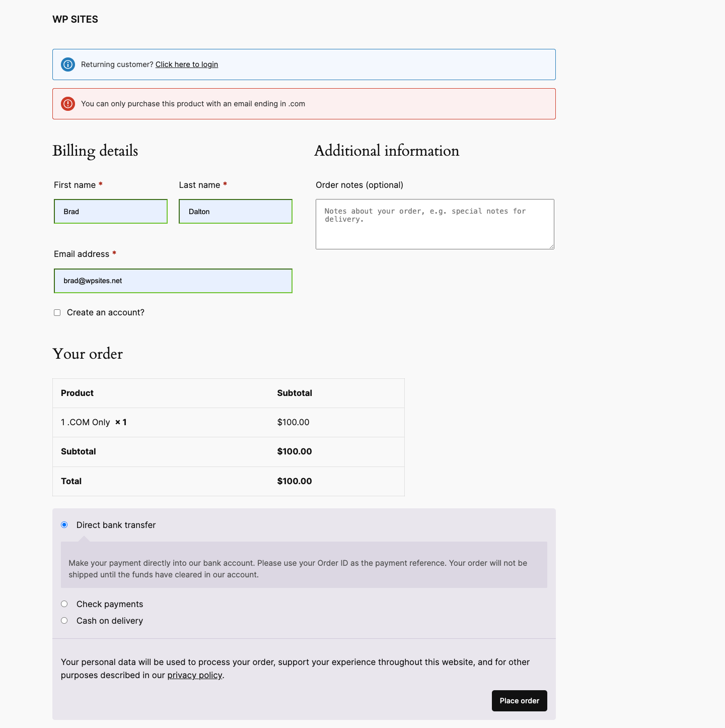 If your customers email address is not included in the settings and/or does not match the allowed email extensions, the customer will not be able to complete the checkout process and a red warning notice will display like this for both logged on and logged out users :