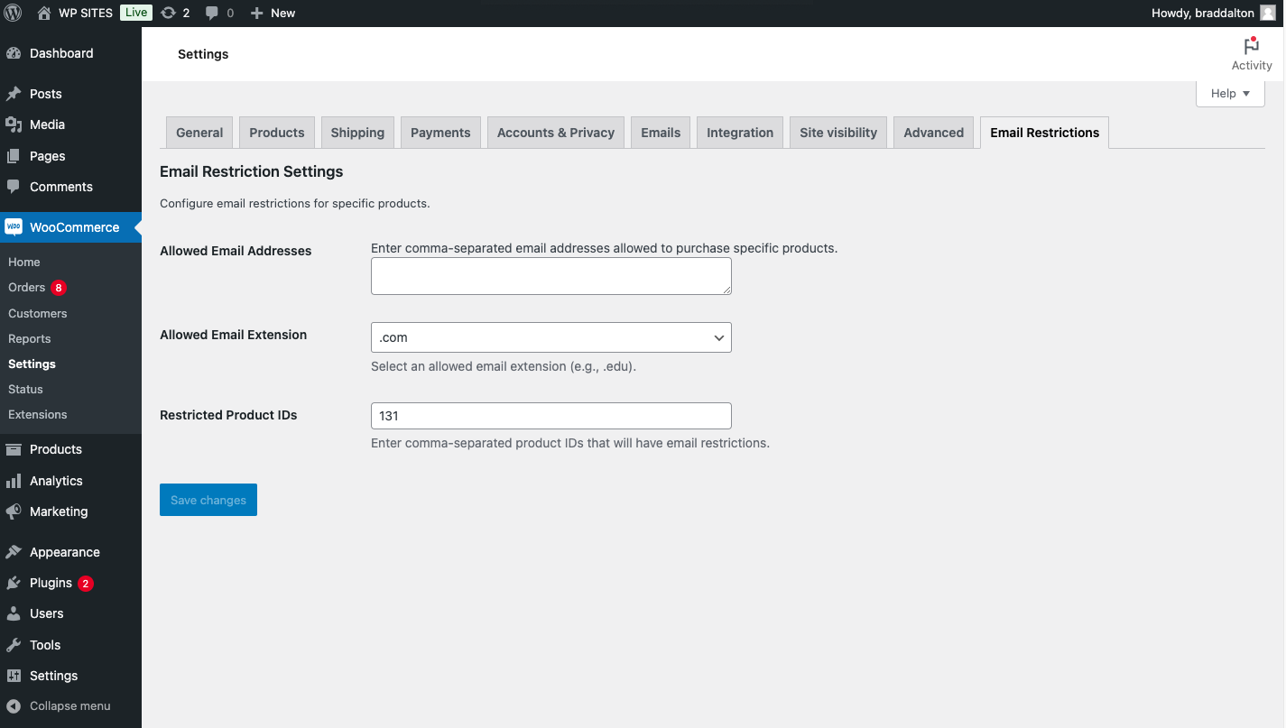 - A text field for adding 1 or more comma-separated product IDs that will have email restrictions.