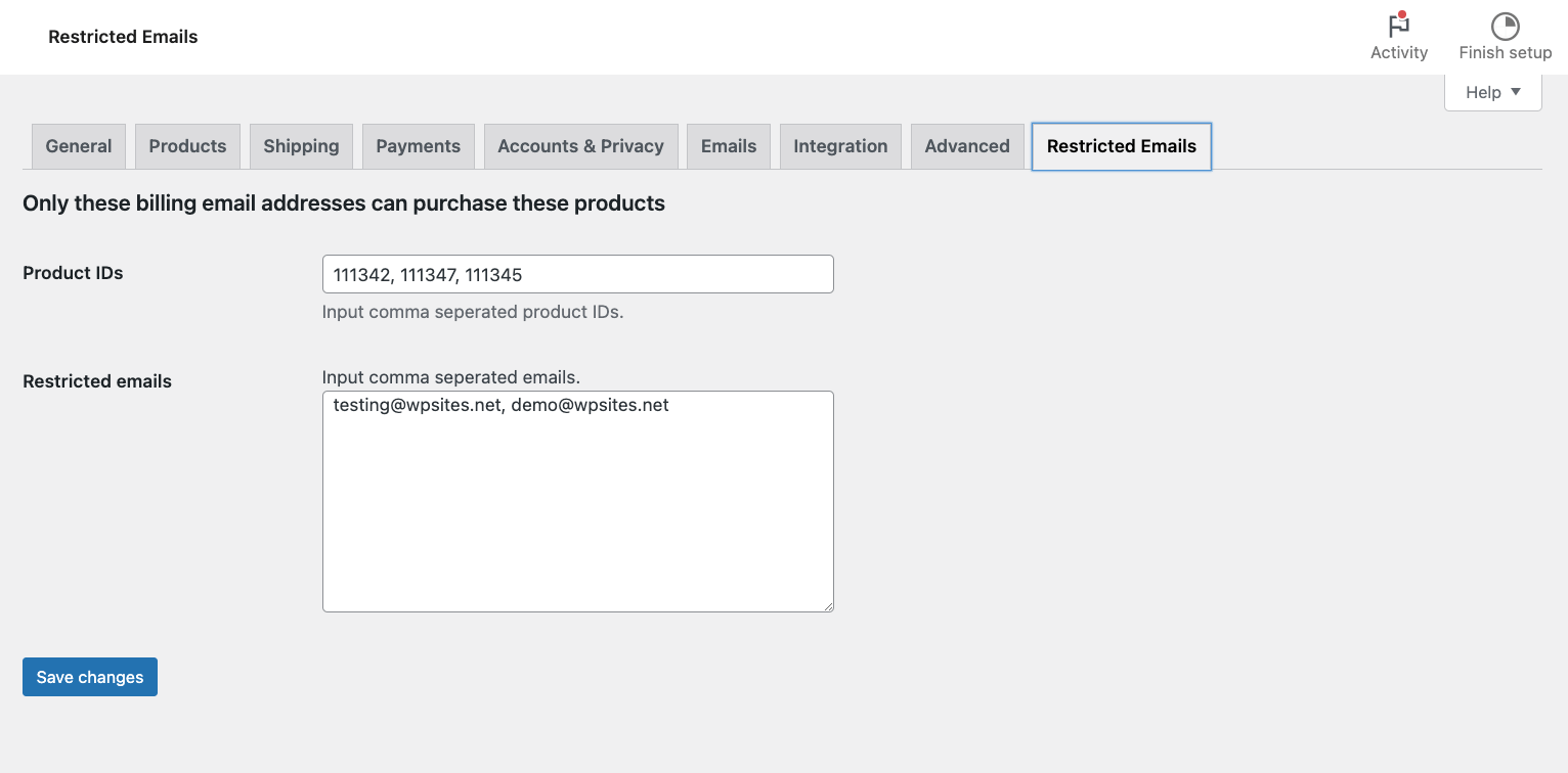 - A text field added to the WooCommerce > Settings page to added a comma separated list of product ids you want restricted.