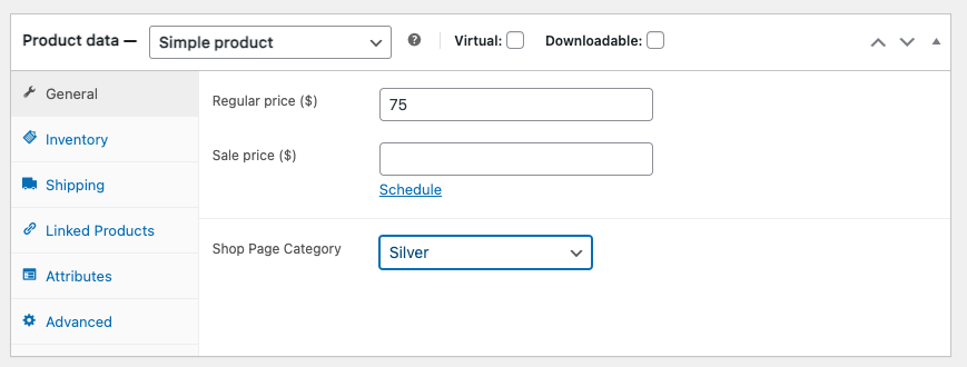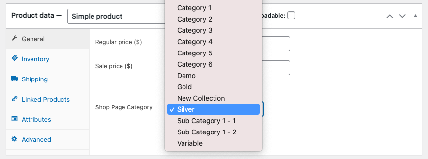 - Adds a drop down selection menu on the edit product screens General tab allowing the admin to select which category to display on the shop page.