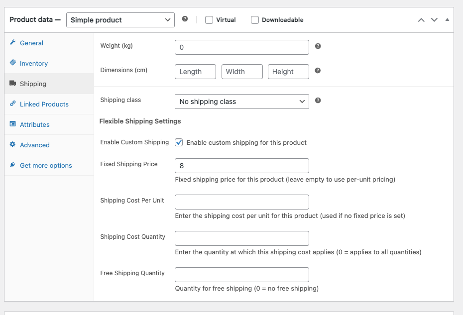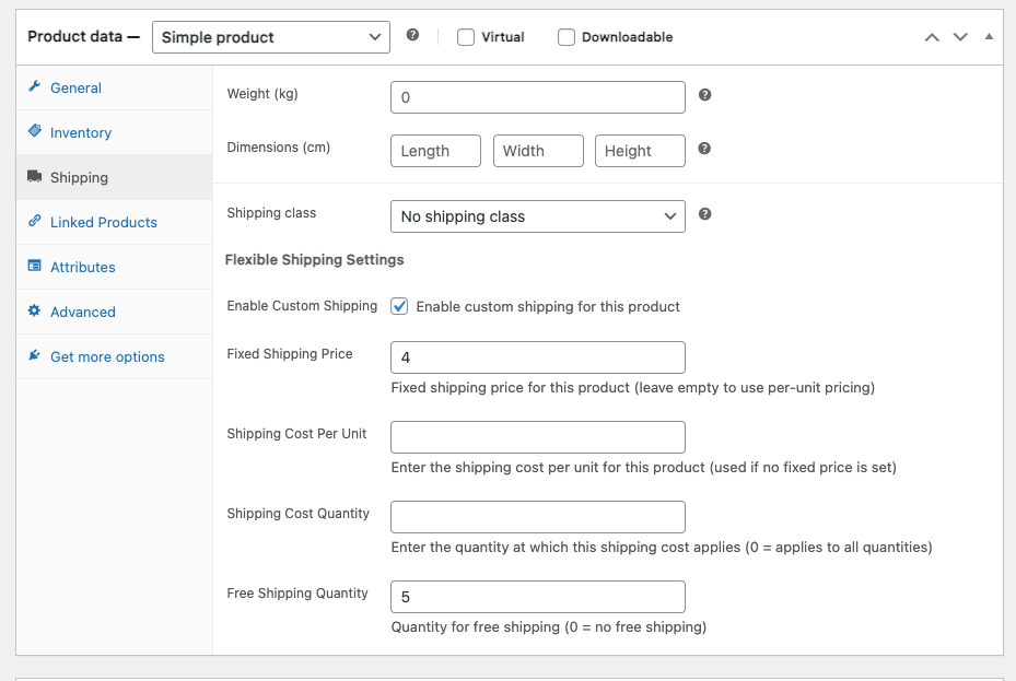 Flexible Shipping Rules gives you complete control over shipping costs on a per-product basis. Set up quantity-based shipping rules, fixed shipping prices, and free shipping thresholds for individual products.