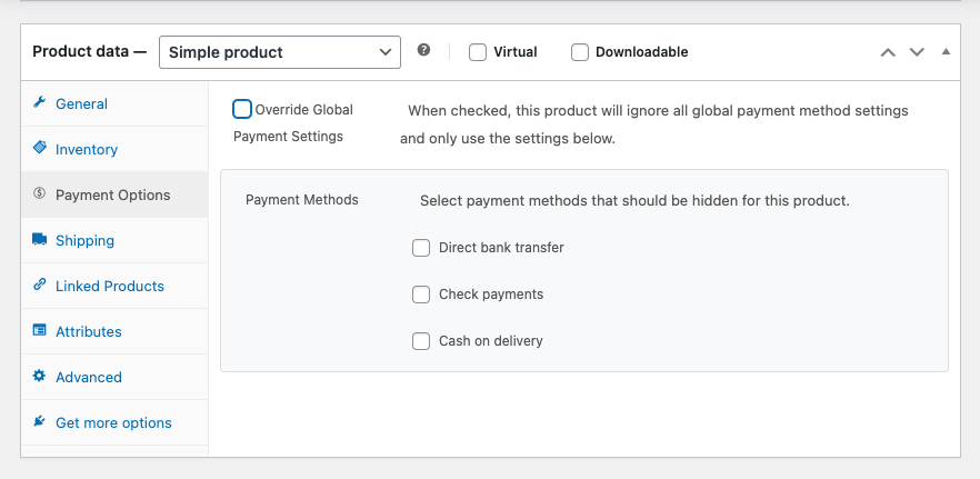 When you enable the override option on a product, it will ignore all global taxonomy-based rules and only use the product-specific payment method settings you’ve selected.
