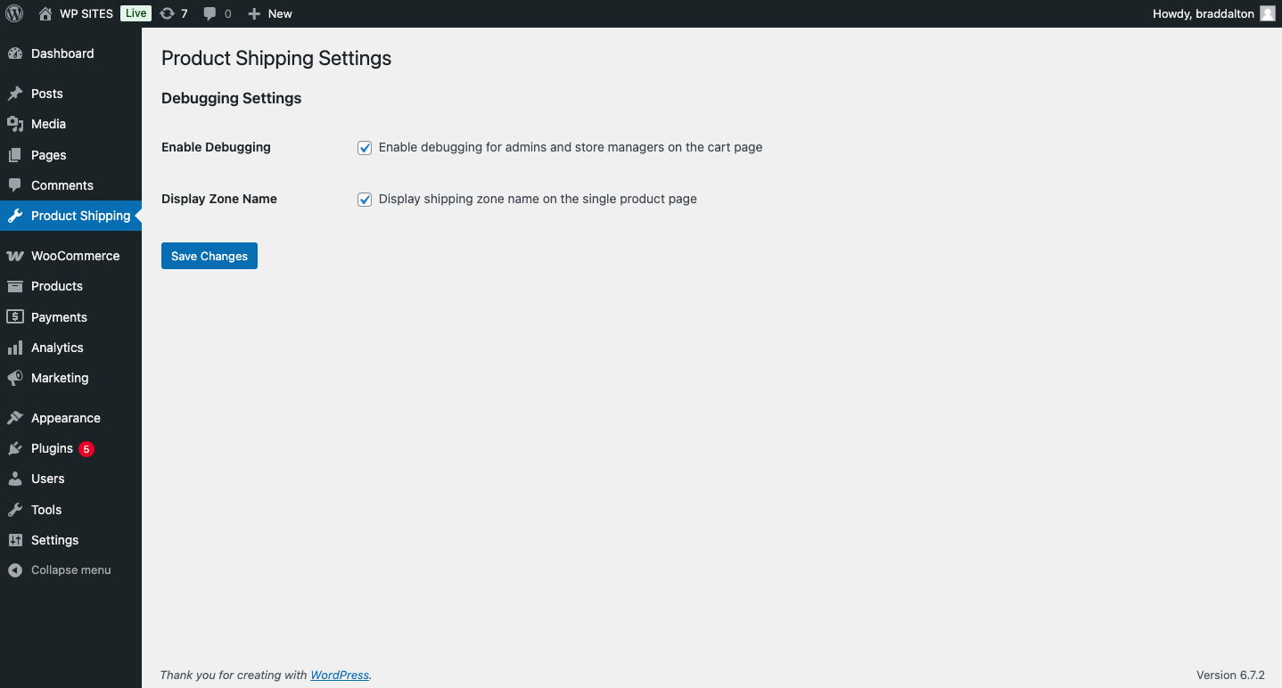 There’s also a settings page for enabling the shipping method id on the frontend of the cart page. Debugging is also built into the code for testing the selected shipping method id on the single product page.