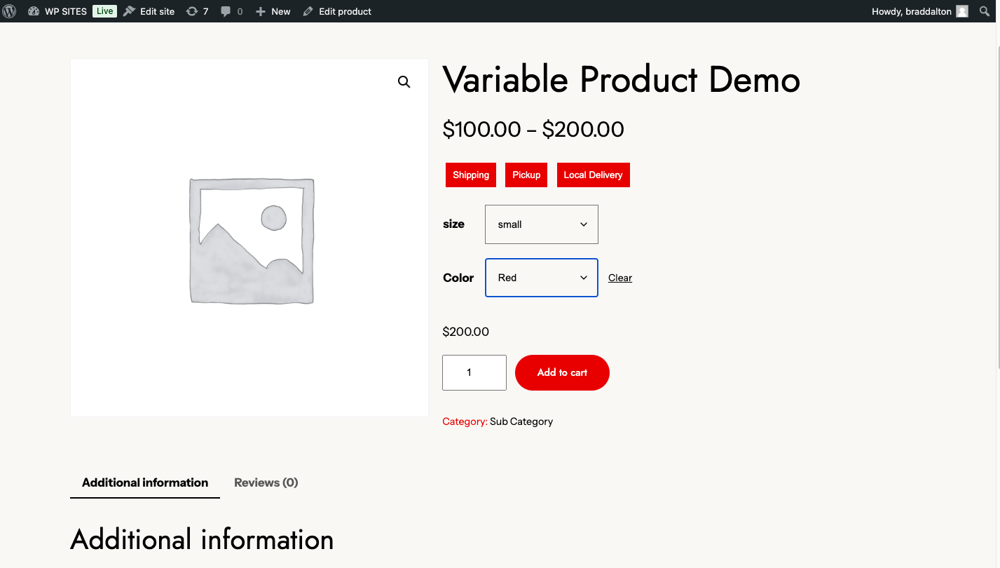 Shows the single product page backend checkboxes, front end shipping method selection buttons when selected and deselected and the cart page only displaying the selected shipping method. Click to enlarge.