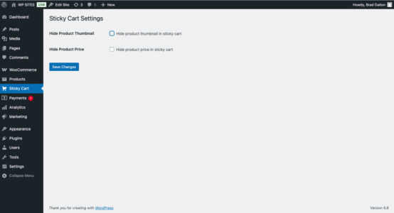 The plugin adds a top level menu page to your WordPress dashboard named Sticky Cart with settings for :