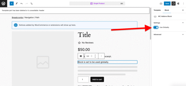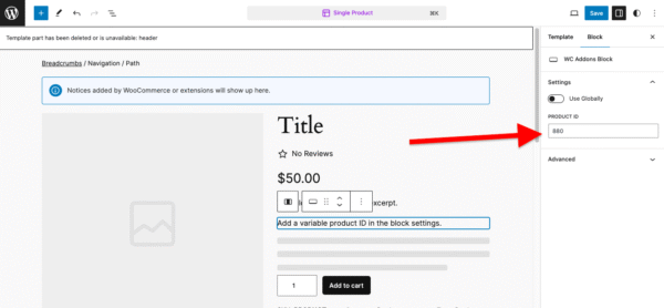 Once you select the block, you can choose to use the block on 1 single product page by entering the product id or globally on all single product pages as seen in the demo video.